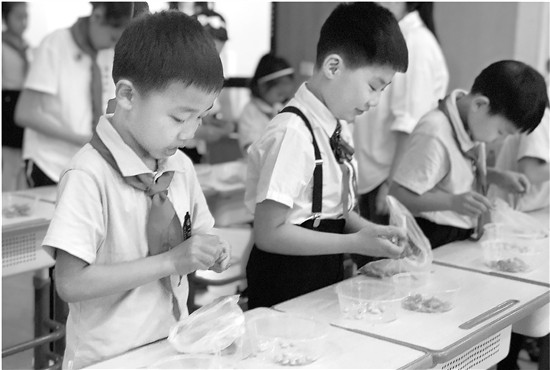看起來,這些孩子都訓(xùn)練有素。學(xué)校二(1)班班主任袁玲玲告訴記者,一個(gè)月前,蔣校長就給孩子們布置了剝毛豆的作業(yè)。
