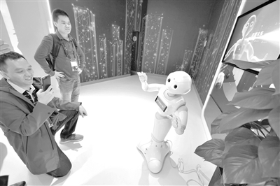 5月26日,參觀者在2019中國國際大數(shù)據(jù)產業(yè)博覽會上與5G+智能機器人進行拍照互動。記者 楊文斌 攝