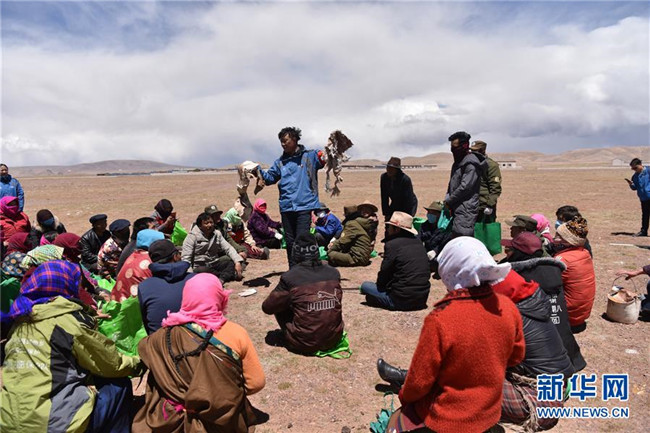 5月28日,瑪曲鄉(xiāng)黨委書(shū)記朗卡江村(中)向參加活動(dòng)的村民講解如何區(qū)分可回收垃圾與不可回收垃圾。新華社記者 周錦帥 攝