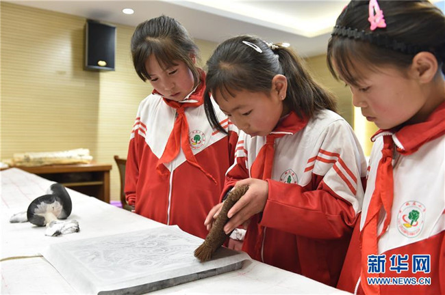 5月31日,學(xué)生們在寧夏固原博物館體驗拓印。新華社記者 唐亞蒙 攝