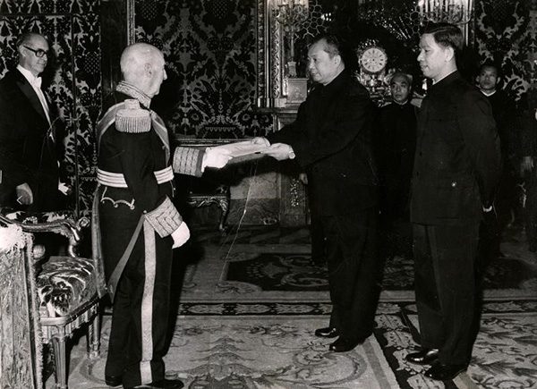 1973年,王珍陪同中國首任駐西班牙大使陳肇源向西班牙國家元首佛朗哥遞交國書。(圖片由王珍提供)