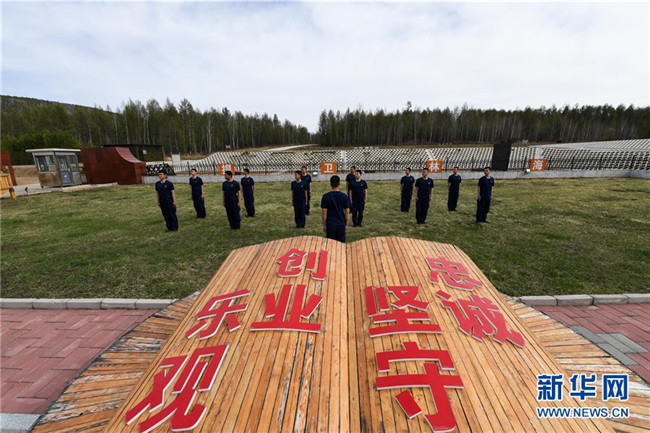 這是內(nèi)蒙古森林消防總隊大興安嶺支隊奇乾中隊的營地,營地后山上的“忠誠”二字是用白樺樹樹干拼接而成(5月15日攝)。新華社記者 劉磊 攝