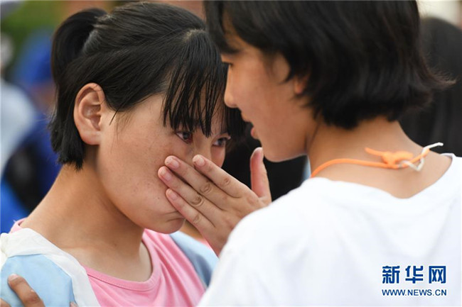 6月9日,合肥市第三十五中學(xué)西藏班的初三畢業(yè)生(右)與老師告別時(shí)落淚。