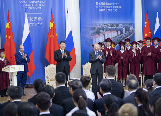 當(dāng)?shù)貢r(shí)間6月6日,又一場(chǎng)特殊儀式在圣彼得堡國立大學(xué)舉行。習(xí)近平被授予圣彼得堡國立大學(xué)名譽(yù)博士學(xué)位。他在答辭中說道,這既是雙方教育和人文領(lǐng)域密切交流的例證,更是中俄關(guān)系高水平的重要體現(xiàn)。他同時(shí)希望雙方不斷擴(kuò)大教育領(lǐng)域交流合作。