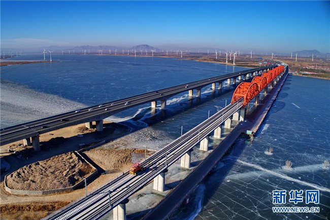 中鐵三局的工人在京張高鐵官廳水庫特大橋進行鋪軌作業(yè)(2019年1月13日無人機拍攝)。新華社記者 楊世堯 攝
