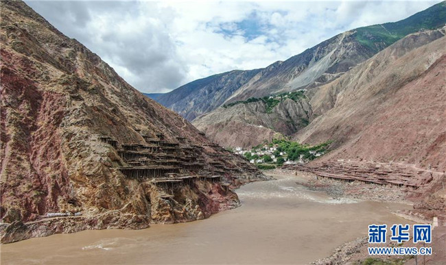 這是位于瀾滄江畔的西藏芒康縣納西民族鄉(xiāng)加達村的鹽田(6月4日無人機拍攝)。新華社記者晉美多吉攝