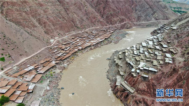 西藏芒康縣納西民族鄉(xiāng)加達村村民在鹽田曬鹽(6月4日攝)。新華社記者晉美多吉攝