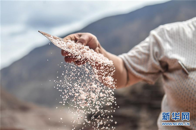西藏芒康縣納西民族鄉(xiāng)加達村一名村民在收集鹽田曬的鹽(6月4日攝)。新華社記者晉美多吉攝