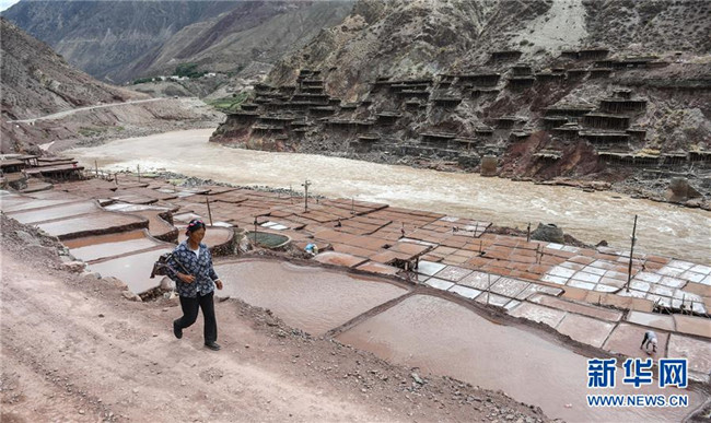 西藏芒康縣納西民族鄉(xiāng)加達村一名村民走過鹽田(6月4日攝)。新華社記者晉美多吉攝