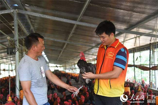 潞城瑤族鄉(xiāng)豐防村第一書記龍啟倍向養(yǎng)雞農(nóng)戶了解養(yǎng)殖情況