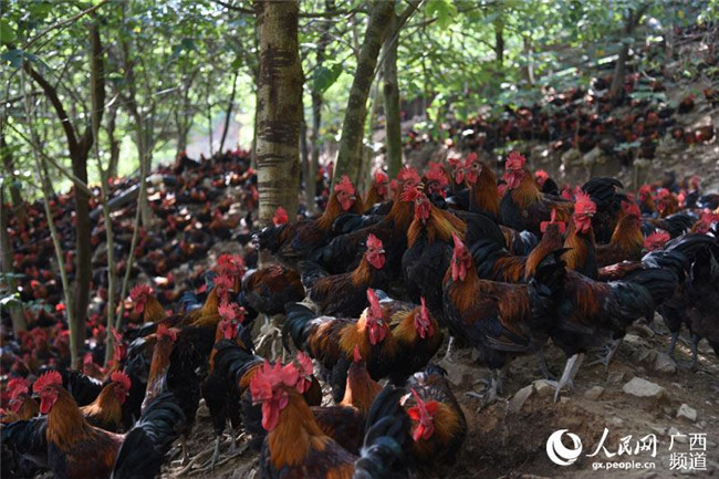 6月18日,在廣西田林縣潞城瑤族鄉(xiāng)豐防村的林下養(yǎng)雞養(yǎng)殖場,一群群瑤土雞來回踱步,在林間或雞棚覓食。一見到生人,便飛快地跑向密林深處,響起一陣此起彼伏的叫聲。