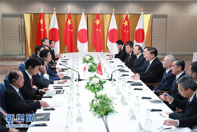 習(xí)近平強(qiáng)調(diào),雙方要始終恪守中日四個(gè)政治文件確立的各項(xiàng)原則,踐行中日“互為合作伙伴、互不構(gòu)成威脅”的政治共識(shí),增進(jìn)互信,推動(dòng)中日關(guān)系始終沿著和平、友好、合作的正確軌道持續(xù)向前發(fā)展。要深化經(jīng)貿(mào)、投資、第三方市場(chǎng)、科技創(chuàng)新等廣泛領(lǐng)域合作,打造新的合作增長(zhǎng)點(diǎn),積極引領(lǐng)區(qū)域經(jīng)濟(jì)一體化。我們歡迎日本企業(yè)積極擴(kuò)大對(duì)華合作,分享中國(guó)發(fā)展新機(jī)遇。共建“一帶一路”倡議為中日互利合作開(kāi)辟了廣闊天地,歡迎日方積極參與。雙方要拉緊人文紐帶,加強(qiáng)兩國(guó)青少年交流,促進(jìn)兩國(guó)民眾相知相親。我贊同年內(nèi)啟動(dòng)中日高級(jí)別人文交流磋商機(jī)制。要通過(guò)對(duì)話(huà)協(xié)商建設(shè)性管控矛盾分歧,加強(qiáng)外交和安全領(lǐng)域?qū)υ?huà),構(gòu)建建設(shè)性雙邊安全關(guān)系。希望日方恪守迄今共識(shí)和承諾,妥善處理好歷史等敏感問(wèn)題,共同維護(hù)東海和平穩(wěn)定。中日應(yīng)該加強(qiáng)在國(guó)際和地區(qū)事務(wù)中的溝通、協(xié)調(diào)、合作,共同應(yīng)對(duì)全球性挑戰(zhàn),推動(dòng)全球治理更加公正合理。中方支持日方辦好二十國(guó)集團(tuán)領(lǐng)導(dǎo)人大阪峰會(huì),期待峰會(huì)發(fā)出維護(hù)多邊主義和自由貿(mào)易的明確聲音,為世界經(jīng)濟(jì)發(fā)展注入穩(wěn)定預(yù)期和動(dòng)力。