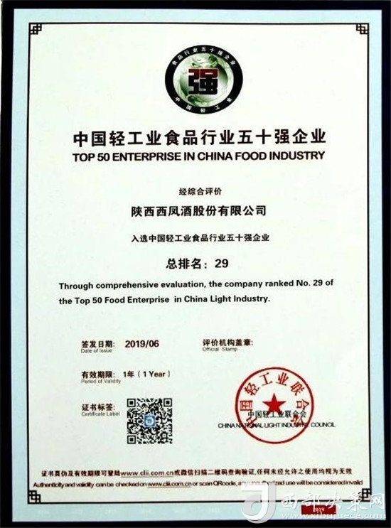 近日,由中國(guó)輕工業(yè)聯(lián)合會(huì)主辦,主題為“強(qiáng)化科技創(chuàng)新,服務(wù)美好生活”的“中國(guó)輕工業(yè)百?gòu)?qiáng)企業(yè)高峰論壇”在北京召開。會(huì)上,中國(guó)輕工業(yè)聯(lián)合會(huì)公布了2018年度中國(guó)輕工業(yè)食品行業(yè)五十強(qiáng)企業(yè),西鳳股份公司憑借良好的發(fā)展業(yè)績(jī)、市場(chǎng)口碑、行業(yè)競(jìng)爭(zhēng)力及日益增強(qiáng)的品牌影響力,被中國(guó)輕工業(yè)聯(lián)合會(huì)授予“中國(guó)輕工業(yè)食品行業(yè)五十強(qiáng)企業(yè)”榮譽(yù)稱號(hào),并受到表彰獎(jiǎng)勵(lì)。