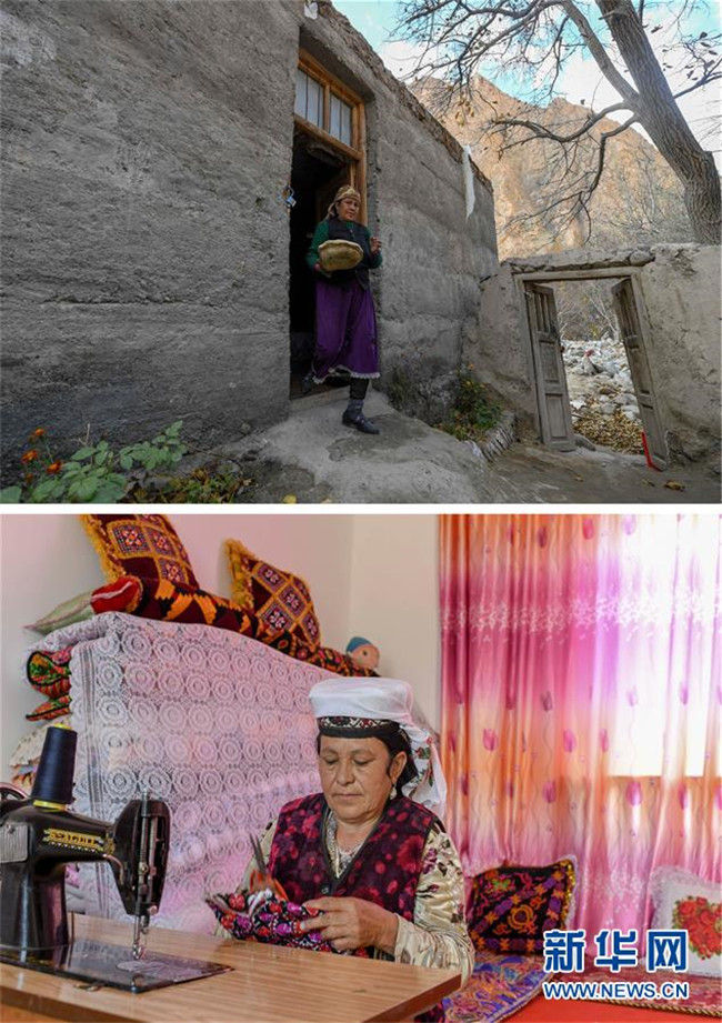拼版照片:上圖為大同鄉(xiāng)庫如克欄桿村村民海熱尼莎·薩木薩克拿著馕走出老房子(2018年11月11日攝);下圖為在新疆塔什庫爾干塔吉克自治縣塔提庫力易地扶貧搬遷安置點新居內(nèi),海熱尼莎在做針線活(2019年6月26日攝)。新華社記者胡虎虎攝