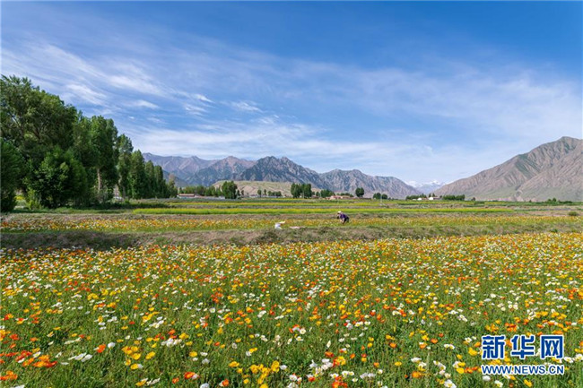 7月6日,甘肅省高臺縣新壩鎮(zhèn)紅沙河村村民在花田中勞作。 新華社發(fā)(鐘曉亮 攝)