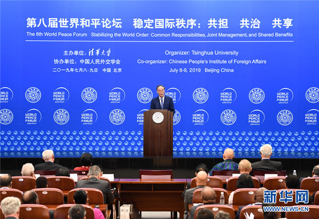 7月8日,以“穩(wěn)定國際秩序:共擔(dān)、共治、共享”為主題的第八屆世界和平論壇在清華大學(xué)舉行,國家副主席王岐山出席開幕式并致辭。 新華社記者 申宏 攝