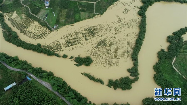 7月9日,廣西柳州市融安縣大將鎮(zhèn)部分地區(qū)被洪水淹沒(無人機拍攝)。新華社發(fā)(譚凱興 攝)