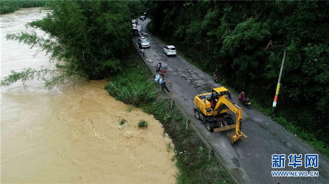 7月9日,在廣西柳州市融安縣大將鎮(zhèn)東潭村,一輛工程車輛在受災地區(qū)待命,準備搶修受損道路(無人機拍攝)。新華社發(fā)(譚凱興 攝)