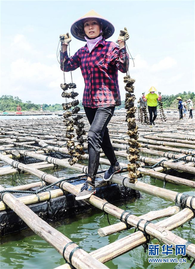 在欽州市龍門港連片萬(wàn)畝大蠔養(yǎng)殖基地,村民在收取養(yǎng)殖的大蠔(7月20日攝)。新華社記者 張愛(ài)林 攝