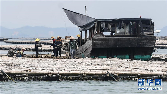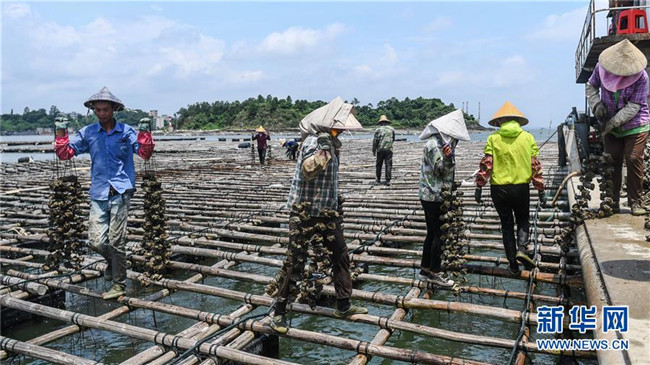 村民在蠔排上提取蠔柱收獲大蠔(7月20日攝)。 新華社記者 張愛(ài)林 攝