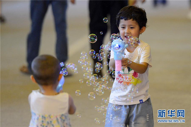 小朋友在吐魯番市長沙·葡萄主題公園夜市玩耍(7月16日攝)。