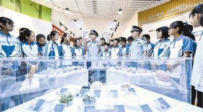 近日,在山東省棗莊市臺兒莊古城中學(xué)的禁毒教育基地,民警向?qū)W生介紹新型毒品的種類、特征和危害,提升他們識毒、防毒、拒毒的意識和能力。新華社記者  高啟民攝