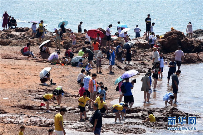 8月6日,游客在青島棧橋景區(qū)海邊游玩。 暑期旅游旺季,海濱城市青島各景區(qū)、景點游人如織。 新華社記者 李紫恒 攝