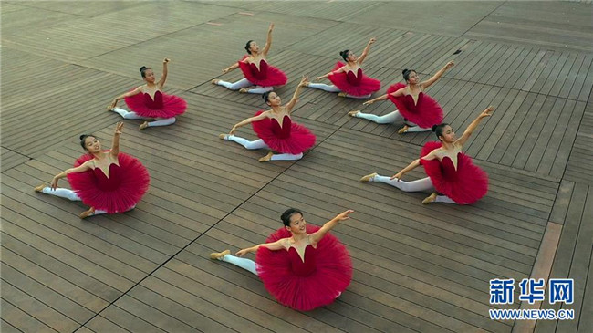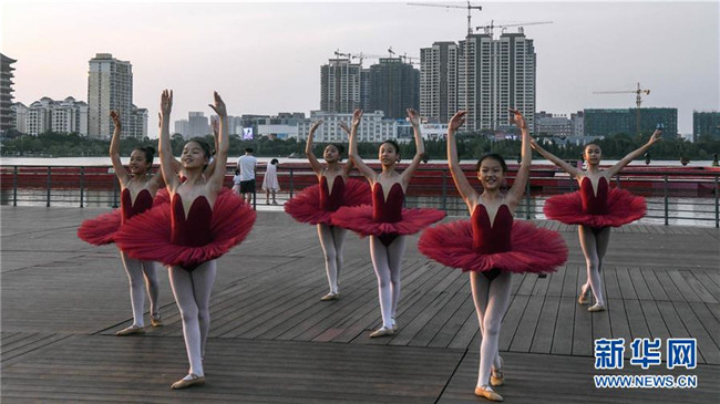 8月7日黃昏時(shí),芭蕾小天使們?cè)跉J州市白石湖公園排練(視頻截圖)。新華社記者 張愛林 攝