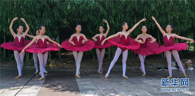 8月9日,芭蕾小天使們?cè)跉J州市夢圓廣場排練節(jié)目。新華社記者 張愛林 攝