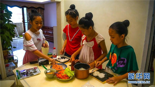 8月6日,芭蕾小天使們?cè)谕榧抑袑W(xué)做壽司(視頻截圖)。新華社記者 張愛林 攝