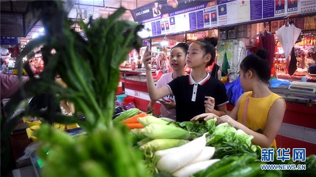8月6日,芭蕾小天使們?cè)谑袌錾腺I菜,幫助父母分擔(dān)家務(wù)活(視頻截圖)。新華社記者 張愛林 攝