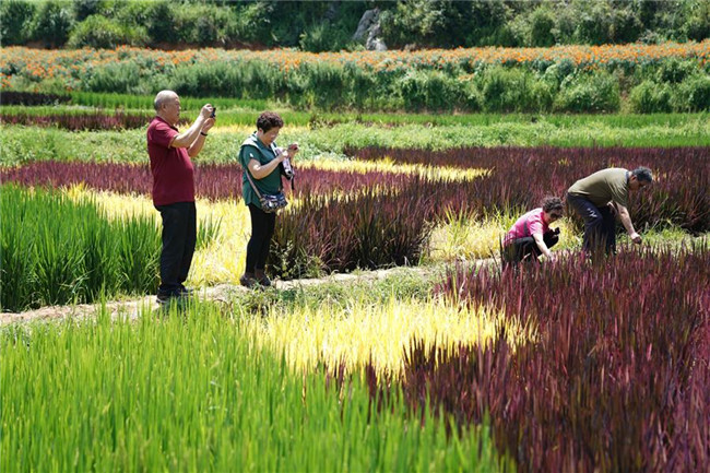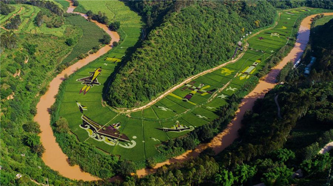 云南省昆明市宜良縣著力打造創(chuàng)意農(nóng)業(yè)、景觀農(nóng)業(yè)、實(shí)現(xiàn)“以農(nóng)帶旅、以旅興農(nóng)”的產(chǎn)業(yè)發(fā)展,其中種植的數(shù)百畝彩色稻田,在田間繪制了各類美麗畫(huà)卷,吸引眾多游客前來(lái)觀光。 新華社記者 秦晴 攝