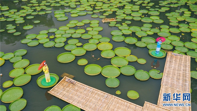 巨大的王蓮葉片如同一個個綠色的大玉盤,錯落有致地鋪滿整個水塘。新華網(wǎng)發(fā)(張嬌嬌 攝)