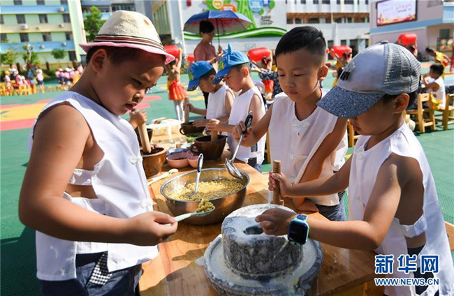 8月20日,贛州市贛縣區(qū)城關(guān)幼兒園的孩子們?cè)隗w驗(yàn)制作擂茶。
