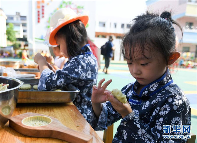 8月20日,江西省贛州市贛縣區(qū)城關(guān)幼兒園的孩子們?cè)隗w驗(yàn)制作米粿。