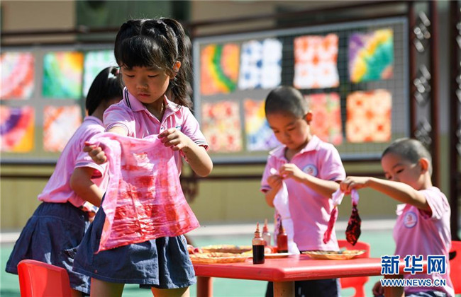 8月20日,江西省贛州市贛縣區(qū)城關(guān)幼兒園的孩子們?cè)隗w驗(yàn)客家扎染工藝。