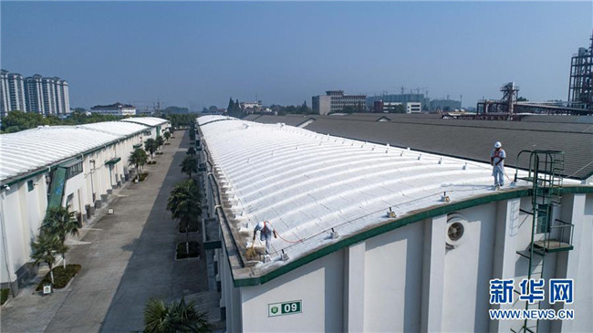 8月26日,中儲(chǔ)糧襄陽(yáng)直屬庫(kù)兩名職工在檢查倉(cāng)房屋面情況(無(wú)人機(jī)拍攝)。