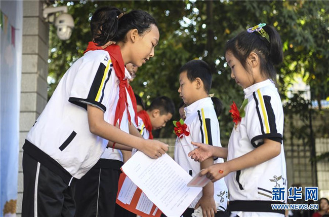 9月4日,新疆教育學(xué)院實(shí)驗(yàn)小學(xué)校園內(nèi),一年級新生與六年級學(xué)生互換心愿卡并鞠躬行禮。