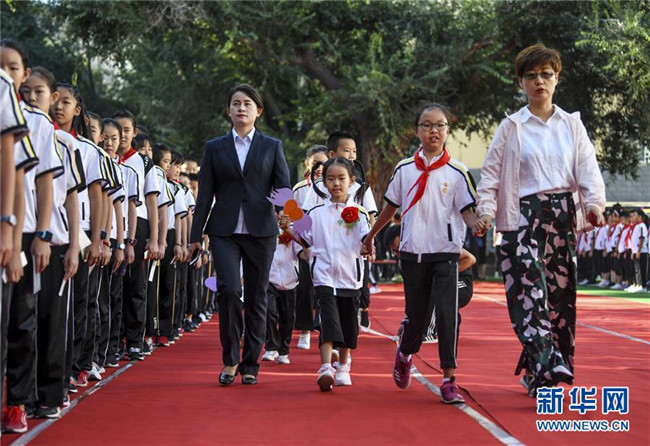 新學(xué)年伊始,新疆教育學(xué)院實(shí)驗(yàn)小學(xué)舉辦主題為“夢想從這里啟航”的開學(xué)典禮,一年級新生在六年級學(xué)生的引領(lǐng)下培養(yǎng)愛學(xué)校、愛師長、愛學(xué)習(xí)的品德,走進(jìn)校園開啟新生活。 新華社記者 王菲 攝