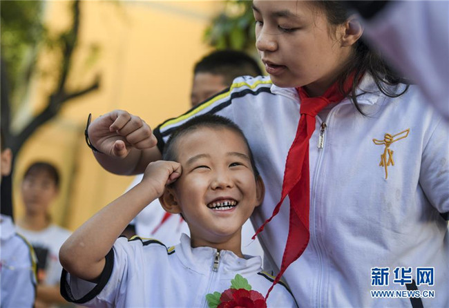 9月4日,新疆教育學(xué)院實(shí)驗(yàn)小學(xué)校園內(nèi),一年級新生在六年級學(xué)生的指導(dǎo)下學(xué)習(xí)握拳宣讀誓言。