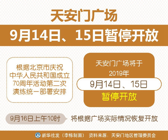 記者從天安門地區(qū)管理委員會(huì)獲悉,根據(jù)北京市慶祝中華人民共和國(guó)成立70周年活動(dòng)第二次演練統(tǒng)一部署安排,天安門廣場(chǎng)將于2019年9月14日、15日暫停開放。9月16日上午10時(shí),將根據(jù)廣場(chǎng)實(shí)際情況恢復(fù)開放。(記者魯暢)