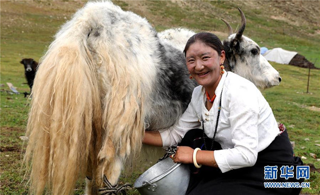 在青海省玉樹(shù)藏族自治州治多縣治渠鄉(xiāng)同卡村,村民昂文西讓的妻子布沙措江卓瑪正在擠牛奶(9月12日攝)。新華社記者韓方方攝