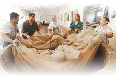 “鳳橋酒廠”里,伙計們用古法釀酒。林松 攝