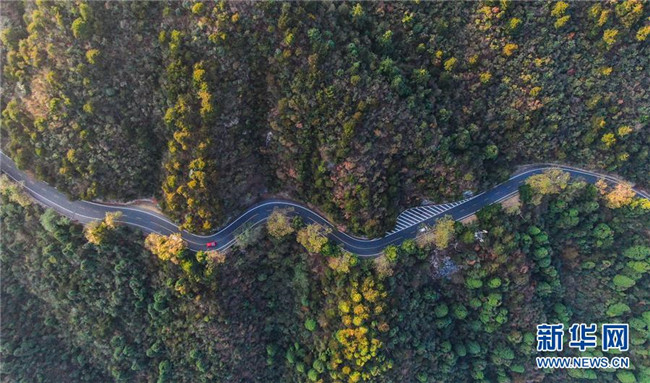 車(chē)輛行駛在通往廬山風(fēng)景區(qū)的北山公路上(10月9日無(wú)人機(jī)拍攝)。新華社記者 胡晨歡 攝