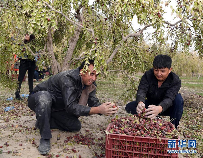 10月19日,在新疆且末縣英吾斯塘鄉(xiāng)阿瓦提村有機紅棗園,圖爾蓀江·吾布力(右)和喀斯木·艾薩在采摘紅棗。