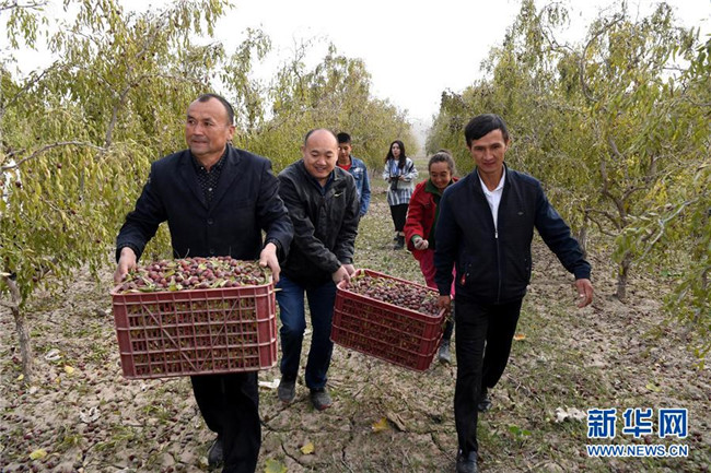 10月19日,在新疆且末縣英吾斯塘鄉(xiāng)阿瓦提村有機紅棗園,村民在搬運紅棗。