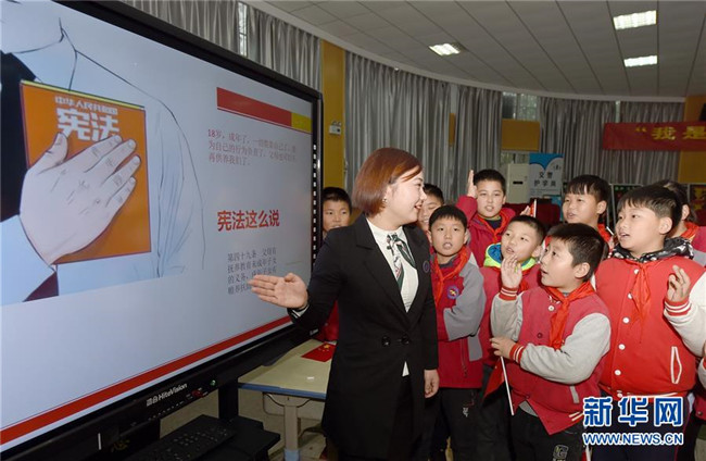 安徽省合肥市經(jīng)開區(qū)明珠居委會法律援助律師在給明珠小學的學生們講解憲法知識(2018年12月3日攝)。 新華社記者 郭晨 攝
