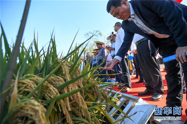 這是第三代雜交水稻新組合試驗(yàn)示范衡南基地測產(chǎn)現(xiàn)場待收割的水稻(10月21日攝)。 新華社記者 陳澤國 攝