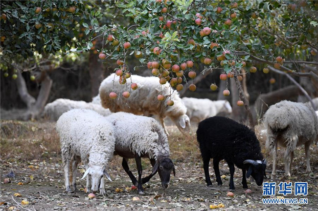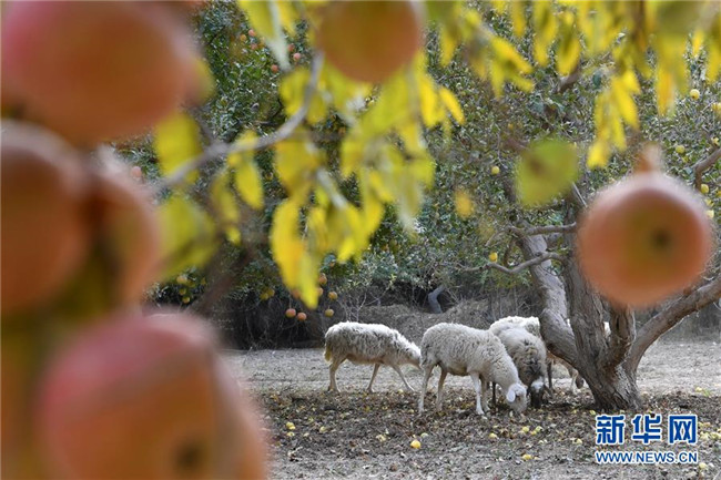 10月24日,羊群在敦煌市郭家堡鎮(zhèn)一處果園里覓食。新華社記者 馬寧 攝