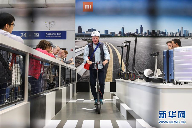 在德國首都柏林舉辦的第59屆柏林國際消費電子展上,一名參觀者在小米公司展區(qū)體驗電動滑板車(9月6日攝)。新華社記者單宇琦攝